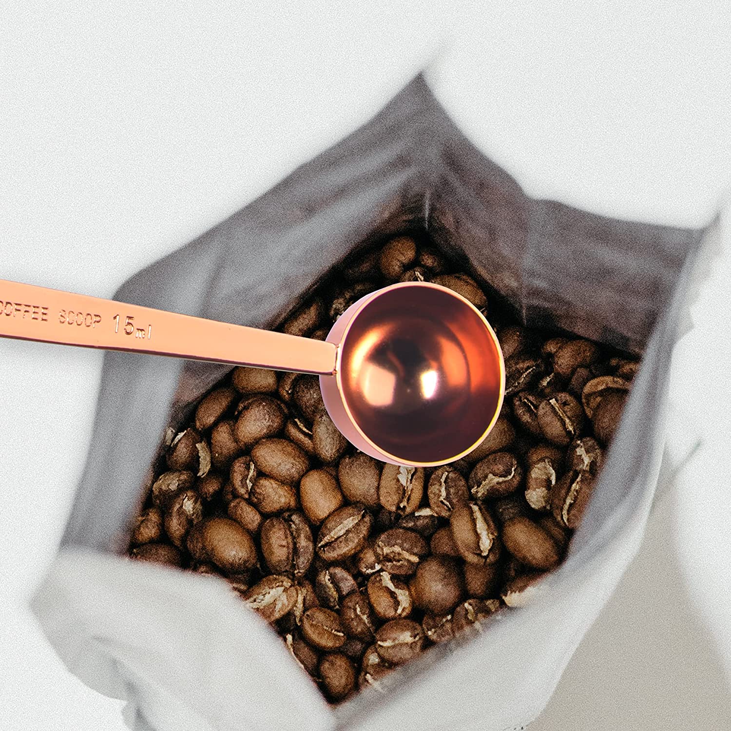 - Rose Gold Scoop. Made of high quality food grade stainless steel, long handle makes it easier to get into the deep recesses of the coffee bag or container.